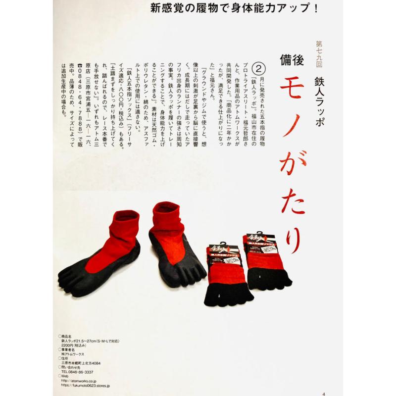 広島県三原市出身、福山市在住のプロマインドトライアスリート・福元哲郎さんが三原の地元企業アトムワークスさんと開発した5本指シューズ「鉄人ラッポ」。アスリートのトレーニングに人気の商品で、地面から足への刺激を受け、指先が分かれていることで得られる地面を掻く感覚は、裸足感覚で基礎筋力を鍛え故障の少ない足腰を養うことができます。